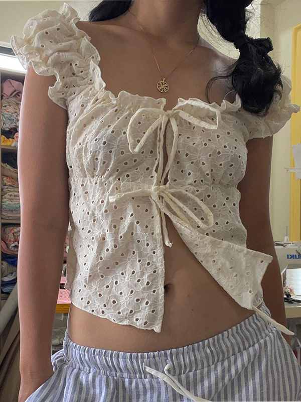 Bowknot Hollow Square Neck Ruffled Tank Top