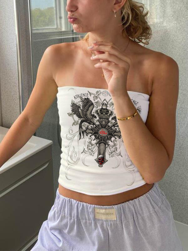 Cross Wings Print White Slim Fit Bandeau Top