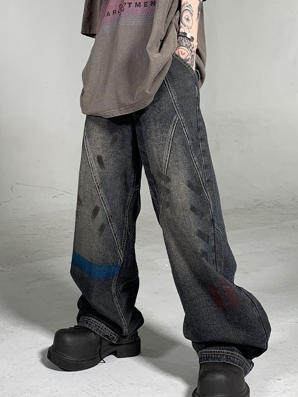 Men’s Street Distressed Splice Graffiti Print Loose Jeans