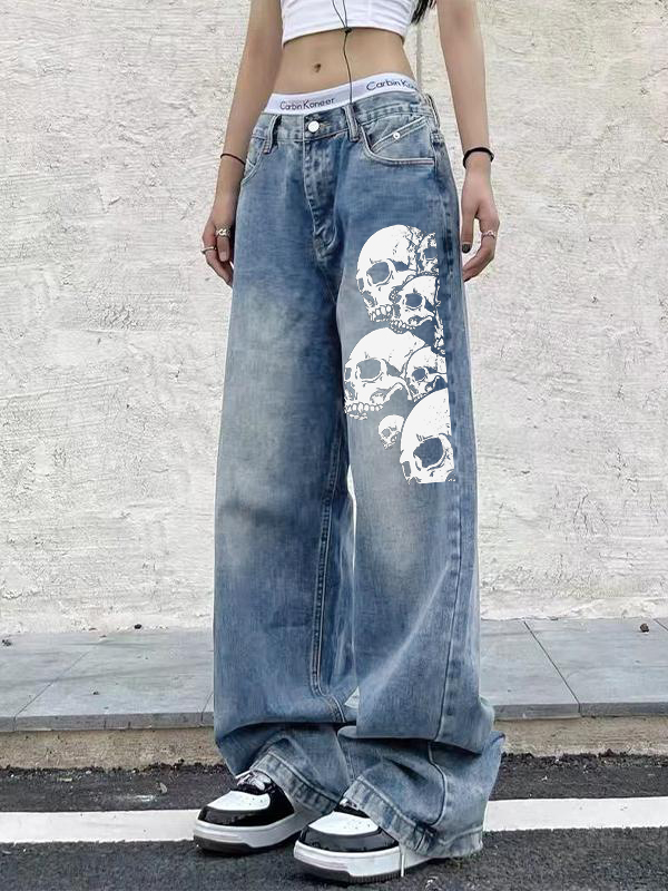 Skull Print Vintage Blue Wide Leg Boyfriend Jeans