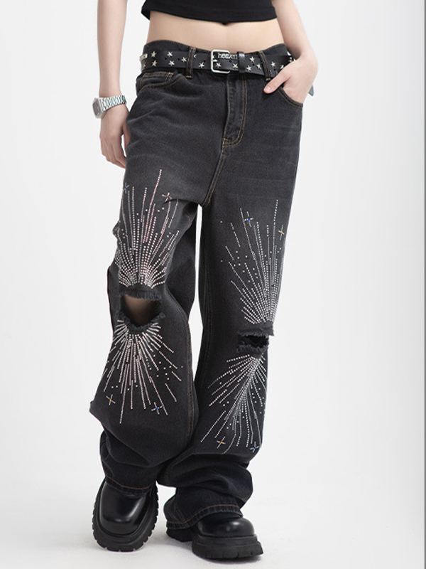 Men’s Firework Rhinestone Print Ripped Straight Leg Jeans