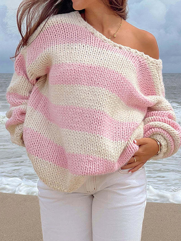 Off The Shoulder Striped Print Oversized Sweaters