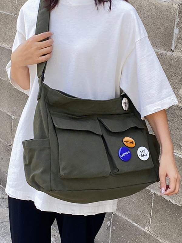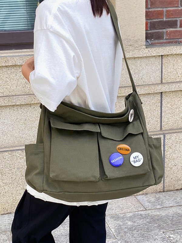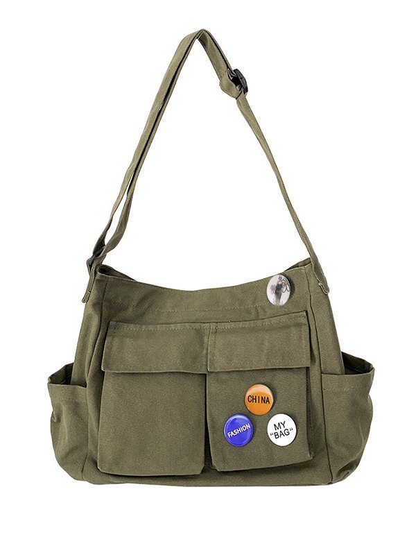 Details: Features an adjustable shoulder strap, with multi badge pendants, inner pockets and zip fly design.