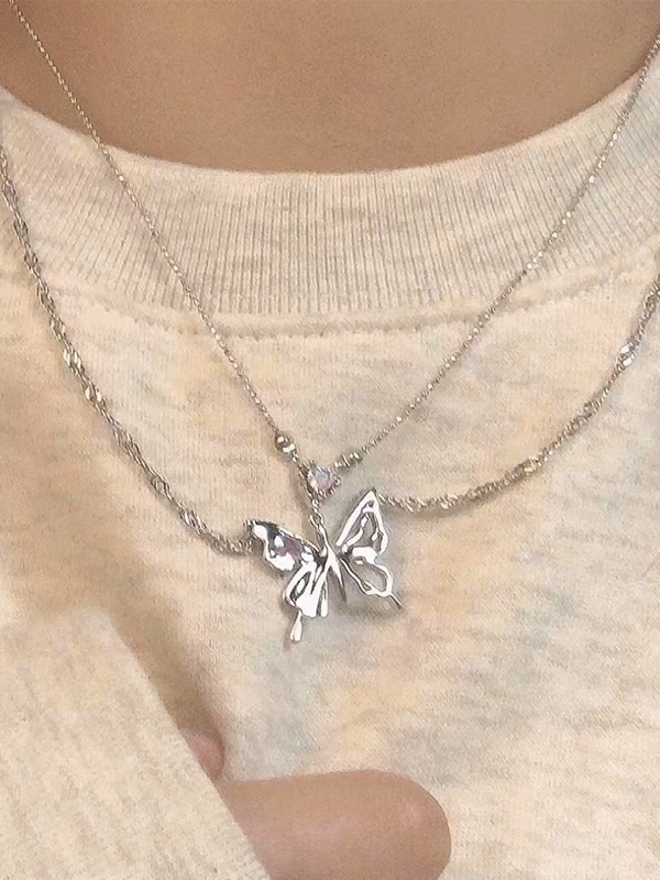 Double Layered Rhinestone Butterfly Pendant Necklace