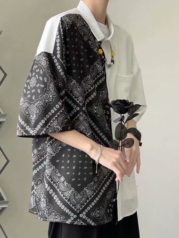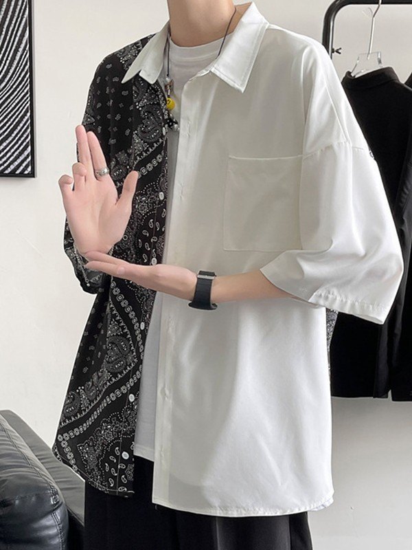 Description: This vintage shirt shaped to a fitted silhouette, features drop shoulder design, with patchwork paisley print design and a pocket patch at chest, complete with button fastening.