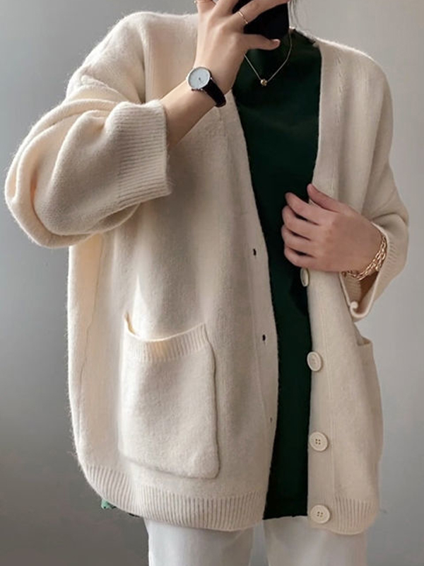 Solid V Neck Breasted Knit Cardigan
