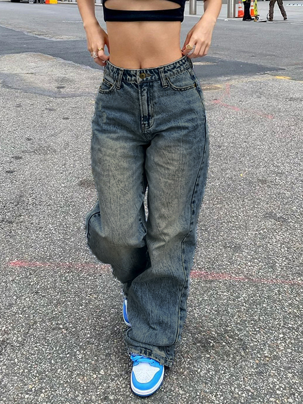 High Waist Straight Leg Washed Trousers Ripped Jeans