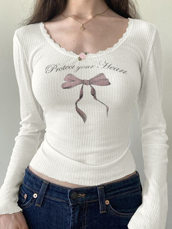 Solid Color Square Neck Bow Slim Long Sleeves Knits