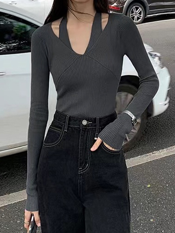 Solid Halter Backless Curvy Hem Long Sleeve Knit