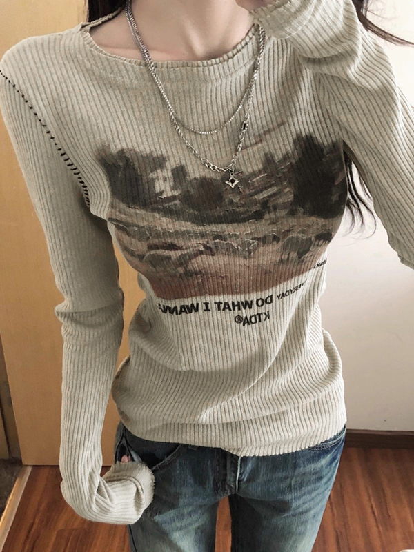 Vintage Print Seam Detail Ribbed Long Sleeve Knit