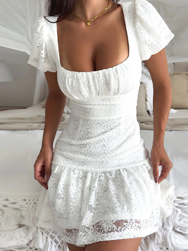 Square Neck Guipure Lace Backless Tie Up Mini Dress