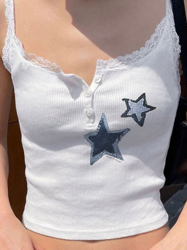 Lace Patchwork Star Print White Cami Top
