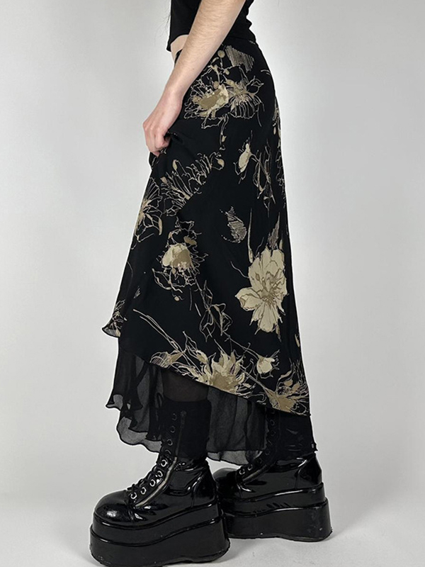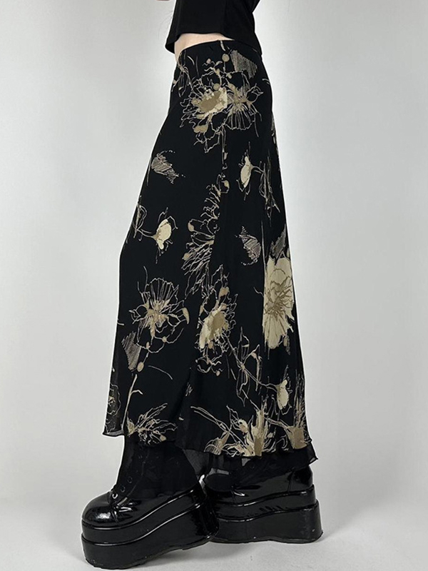 European And American Style Retro Tie-Dye Floral Print Mesh Maxi Skirts